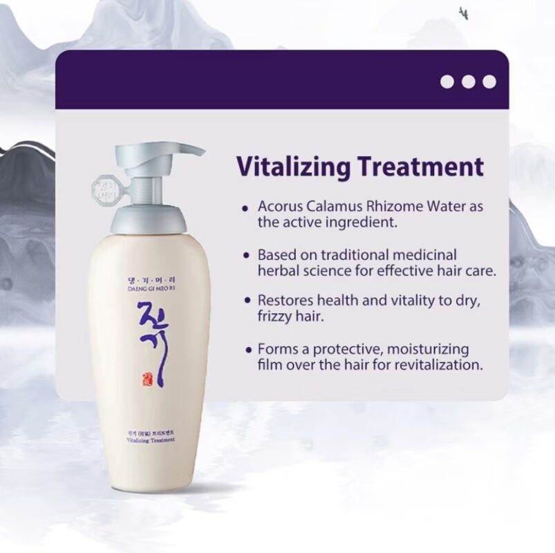 The Daeng Gi Meo Ri Vitalizing Treatment, enriched with keratin, centella asiatica, and ginseng, effectively softens your hair without adding any heaviness. Even if a bit of the product touches your roots, there's no need to wash your hair to remove any greasiness.