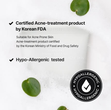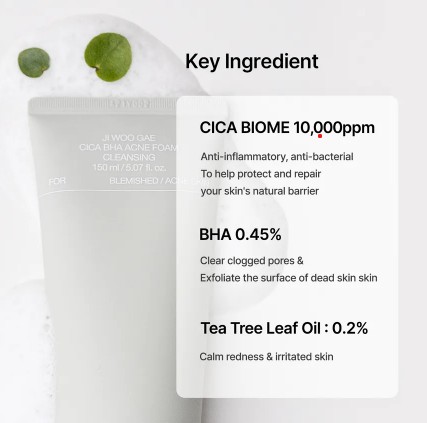 A cleansing foam infused with Salicylic Acid provides a gentle yet effective cleanse, targeting skin impurities while helping to regulate acne and excess sebum. It features 10,000 ppm Cica Biome Complex to safeguard the skin barrier, 0.45% BHA for exfoliating clogged pores and eliminating dead skin cells, and 0.2% Tea Tree Leaf Oil to calm irritated skin and reduce redness. This product is hypoallergenic and certified by the Korean FDA as an acne treatment, making it ideal for those with acne-prone skin.