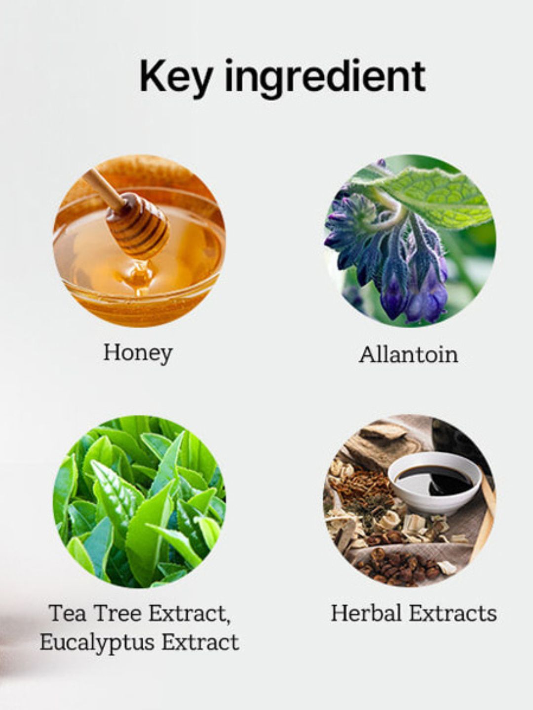 Water, Alcohol, PEG-60 Hydrogenated Castor Oil, Dipropylene Glycol, Coptis Japonica Root Extract, Allantoin, Eucalyptus Globulus Leaf Extract, Honey(100ppm), Melaleuca Alternifolia (Tea Tree) Extract, Trapa Japonica Fruit Extract, Cyclodextrin, Tocopherol, Glycine, Serine, Glutamic Acid, Aspartic Acid, Leucine, Alanine, Lysine, Arginine, Tyrosine, Phenylalanine, Threonine, Proline, Valine, Isoleucine, Histidine, Methionine, Cysteine, Acetyl Hexapeptide-8, Copper Tripeptide-1, Palmitoyl Pentapeptide-4, Butyl Avocadate, l-Menthol, Tromethamine, Salicylic Acid, Dexpanthenol, Acrylates/C10-30 Alkyl Acrylate Crosspolymer, Butylene Glycol, Disodium EDTA, Camphor, 1,2-Hexanediol, Ethylhexylglycerin, Glyceryl Caprylate, Caprylyl Glycol, Fragrance, Linalool, Benzyl Benzoate, Citronellol, Limonene
