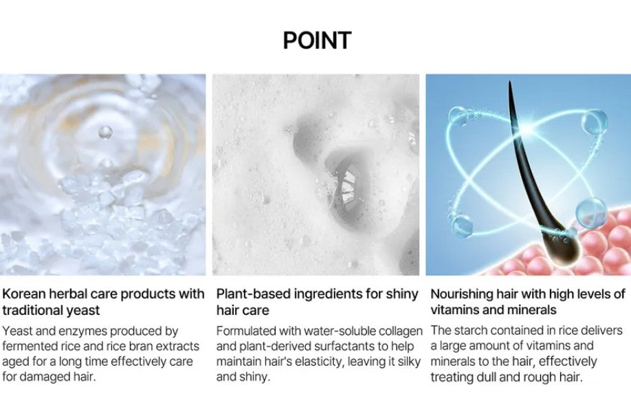 Key Ingredients: Rice Fermentation Extracts and Rice Bran Extract: These ingredients are rich in yeast and enzymes that assist in repairing damaged strands and boosting hair elasticity. Vitamins and Minerals: Packed with essential nutrients, they work to revitalize dull and rough hair. Hydrolyzed Collagen and Protein Complex: These components contribute to overall hair health. Unique Features: The treatment has a gel-like texture enriched with fine pearls that create a rich foam, effectively cleansing impurities from the scalp.
