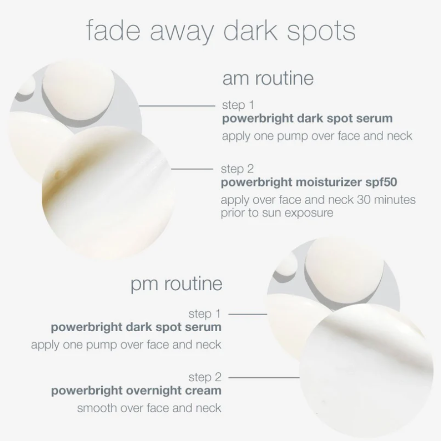 Powerbright Dark spot serum – Water/Aqua/Eau, Ethylhexyl Isononanoate, Triolein, Niacinamide, C12-16 Alcohols, 1,2-Hexanediol, Coco-Caprylate/Caprate, Lentinus Edodes Mycelium Extract, C18-36 Acid Triglyceride, Acrylates Copolymer, Butylene Glycol, Ectoin, Paeonia Suffruticosa Root Extract, Jojoba Esters, Hydroxyacetophenone, Hexylresorcinol, Phytosteryl Macadamiate, Sodium Hyaluronate Crosspolymer, Withania Somnifera Root Extract, Phytosterols, Sodium Levulinate, C12-18 Acid Triglyceride, Raspberry Ketone, Mimosa Tenuiflora Bark Extract, Vanilla Planifolia Fruit, Ilex Paraguariensis Leaf Extract, Helianthus Annuus (Sunflower) Seed Oil, Prunus Amygdalus Dulcis (Sweet Almond) Oil, Citrus Aurantium Dulcis (Orange) Peel Oil, Citrus Aurantium Bergamia (Bergamot) Fruit Oil, Citrus Medica Limonum (Lemon) Peel Oil, Citrus Paradisi (Grapefruit) Peel Oil, Ricinus Communis (Castor) Seed Oil, Rosmarinus Officinalis (Rosemary) Leaf Extract, Cistus Ladaniferus Resin, Zingiber Officinale (Ginger) Root Oil, Lavandula Angustifolia (Lavender) Oil, Ribes Nigrum (Black Currant) Seed Oil, Jasminum Sambac (Jasmine) Flower Extract, Cucumis Sativus (Cucumber) Seed Oil, Dipteryx Odorata Seed Extract, Styrax Benzoin Resin Extract, Viola Odorata Leaf Extract, Juniperus Virginiana Oil, Titanium Dioxide, Tocopherol, Ethylhexylglycerin, Xanthan Gum, Sclerotium Gum, Hydrogenated Lecithin, Lecithin, Palmitic Acid, Octyldecanol, Glycerin, Octyldodecyl Oleate, Squalene, Octyldodecyl Stearoyl Stearate, Tetrasodium Glutamate Diacetate, Caprylyl Glycol, Benzyl Glycol, Laureth-21, Pullulan, Silica, Alumina, Sodium Hydroxide, Sodium Dehydroacetate, Sodium Benzoate, Citral, Limonene, Linalool. powerbright moisturizer spf 50 – Water/Aqua/Eau, Octocrylene, Carthamus Tinctorius (Safflower) Oleosomes, Butylene Glycol, Homosalate, C12-15 Alkyl Benzoate, Butyl Methoxydibenzoylmethane, Octisalate, Niacinamide, Polysorbate 80, Laminaria Digitata Extract, Lavandula Hybrida Oil, Lavandula Angustifolia (Lavender) Flower Extract, Cananga Odorata Flower Oil, Eucalyptol, Glycerin, Pentylene Glycol, PPG-12/SMDI Copolymer, Bisabolol, Ethylhexylglycerin, Caprylyl Glycol, Glycogen, Sodium Hyaluronate, Dipotassium Glycyrrhizate, Gluconolactone, Acrylates/C10-30 Alkyl Acrylate Crosspolymer, Glyceryl Polyacrylate, Propanediol, Trisodium Ethylenediamine Disuccinate, Ammonium Acryloyldimethyltaurate/VP Copolymer, Polymethylsilsesquioxane, Silica, Sodium Benzoate, Sodium Hydroxide, Benzyl Benzoate, Benzyl Salicylate, Farnesol, Limonene, Linalool, Geraniol, IsoeugenolWater/Aqua/Eau, Octocrylene, Carthamus Tinctorius (Safflower) Oleosomes, Butylene Glycol, Homosalate, C12-15 Alkyl Benzoate, Butyl Methoxydibenzoylmethane, Octisalate, Niacinamide, Polysorbate 80, Laminaria Digitata Extract, Lavandula Hybrida Oil, Lavandula Angustifolia (Lavender) Flower Extract, Cananga Odorata Flower Oil, Eucalyptol, Glycerin, Pentylene Glycol, PPG-12/SMDI Copolymer, Bisabolol, Ethylhexylglycerin, Caprylyl Glycol, Glycogen, Sodium Hyaluronate, Dipotassium Glycyrrhizate, Gluconolactone, Acrylates/C10-30 Alkyl Acrylate Crosspolymer, Glyceryl Polyacrylate, Propanediol, Trisodium Ethylenediamine Disuccinate, Ammonium Acryloyldimethyltaurate/VP Copolymer, Polymethylsilsesquioxane, Silica, Sodium Benzoate, Sodium Hydroxide, Benzyl Benzoate, Benzyl Salicylate, Farnesol, Limonene, Linalool, Geraniol, Isoeugenol Powerbright overnight cream – Aqua/Water/Eau, Dimethicone, Methylheptyl Isostearate, Butylene Glycol, Niacinamide, 1,2-Hexanediol, Cetearyl Ethylhexanoate, Cetyl Alcohol, Isohexadecane, Cetearyl Alcohol, Glyceryl Stearate Citrate, Rubus Idaeus (Raspberry) Seed Oil, Vaccinium Macrocarpon (Cranberry) Seed Oil, Hexylresorcinol, Lactobacillus/Pumpkin Ferment Extract, Cananga Odorata Flower Oil, Citrus Aurantium Dulcis (Orange) Peel Oil, Citrus Limon (Lemon) Peel Oil, Prunus Amygdalus Dulcis (Sweet Almond) Oil, Juniperus Mexicana Oil, Rosa Damascena Flower Oil, Hydroxyacetophenone, Dipotassium Glycyrrhizate, Lactobacillus Ferment, Potassium Cetyl Phosphate, Hydrogenated Phosphatidylcholine, Phytosterols, Dimethicone Crosspolymer, Acrylates/C10-30 Alkyl Acrylate Crosspolymer, Aminomethyl Propanol, Glyceryl Caprylate, Polysilicone-11, Tocopherol, Tetrasodium Glutamate Diacetate, Zinc Glycinate, Magnesium Ascorbyl Phosphate, Isostearic Acid, Benzyl Benzoate, Decyl Glucoside, Benzyl Salicylate, Sodium Hydroxide, Sodium Glycolate, Sodium Formate, Dimethiconol, Limonene, Farnesol