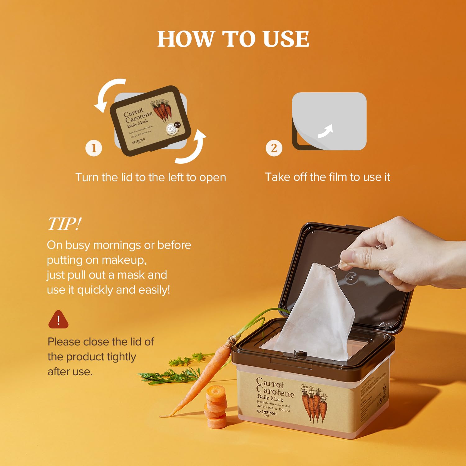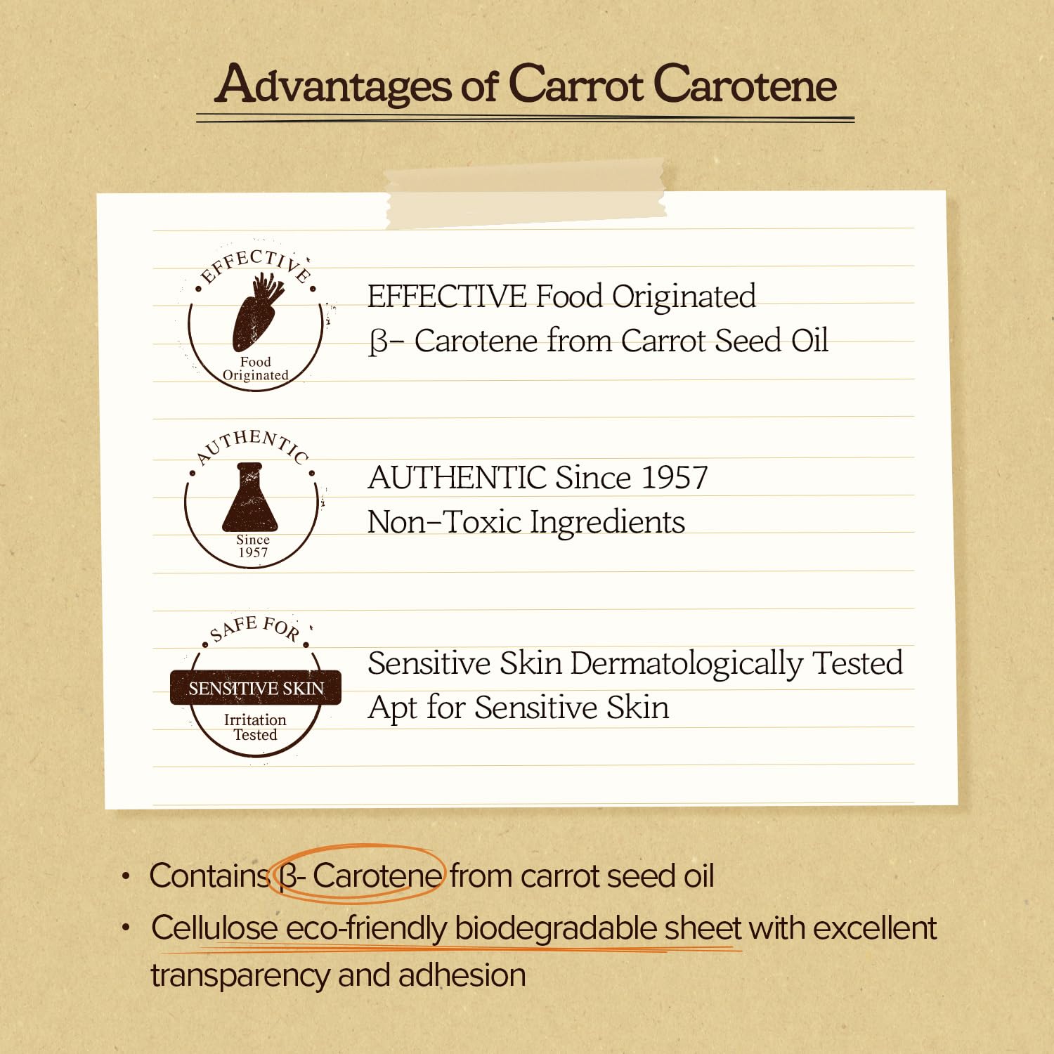 - A daily sheet mask infused with carrot extract rich in beta-carotene to soothe and hydrate the irritated skin.