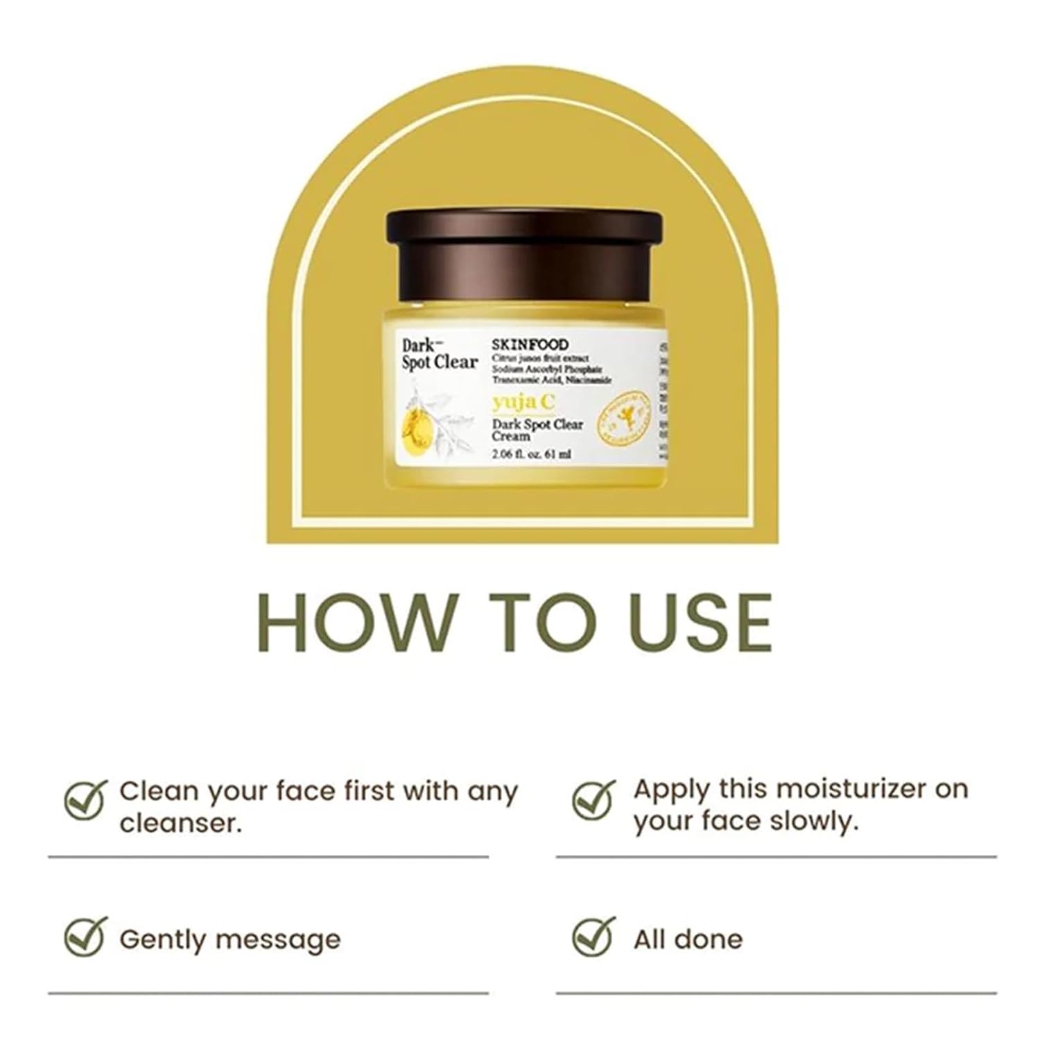 SKINFOOD Yuja C Dark Spot Clear Cream 61ml is specially formulated to target and diminish the appearance of dark spots, hyperpigmentation, and uneven skin tone. For that purpose, it features a unique blend of ingredients. At its core is the extract of Yuja fruit, a citrus fruit renowned for its vitamin C content. In addition, the formula includes a vitamin C derivative, tranexamic acid, and niacinamide. That said, vitamin C is a powerful antioxidant that helps combat skin-damaging free radicals but also has brightening properties consequently reducing pigmentation and increasing skin radiance. When paired with niacinamide and tranexamic acid, the result is a powerful cream that fights dark spots and brightens the complexion. In addition, this moisturizer features glutathione vitamin capsules that boast not only antioxidant properties but also brightening benefits. All in all, this moisturizer helps reduce the appearance of dark spots and restores a luminous complexion.